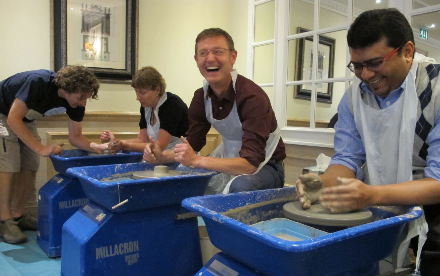 We kicked off with an ice-breaking and interactive potter’s wheel demonstration. Participants were split into smaller groups – each group responsible for making a separate section of the coat of arms, each section depicting a different aspect of the organisation. As well as the tile making, everybody took turns on the potter’s wheel to produce a ‘thrown’ element to be added to their design.